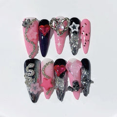Pink Black Gothic Heart Crystal Statement Press On Nails