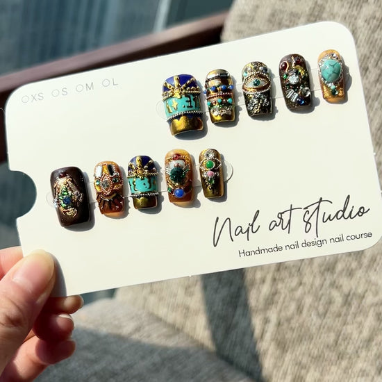 The artist has meticulously layered antique gold textures with the regal hues of lapis lazuli blue and vibrant turquoise. Each nail tells a story: from the protective "Eye of Horus" motif crafted from pearls and gems to the heavy, encrusted armor of gold chains and colorful stones. The "more is more" aesthetic captures the opulence of a lost empire. Every rhinestone, bead, and metal accent is placed by hand to create a rich, 3D relief effect that demands attention.