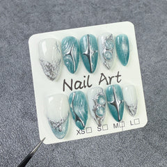 Uñas postizas con efecto ojo de gato, con efecto almendra y relieve metálico, hechas a mano | 365nails