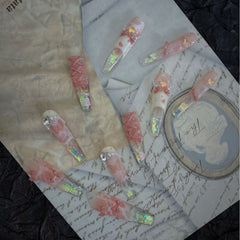 Sheer nude‑pink meets milky white panels, finished with iridescent flake tips and jelly‑clear ends. Frosted hearts, bow reliefs, corset‑style metallic lacing, and tiny star accents add rich dimension. Long tapered‑square shape—sweet, dreamy, with a playful retro touch.