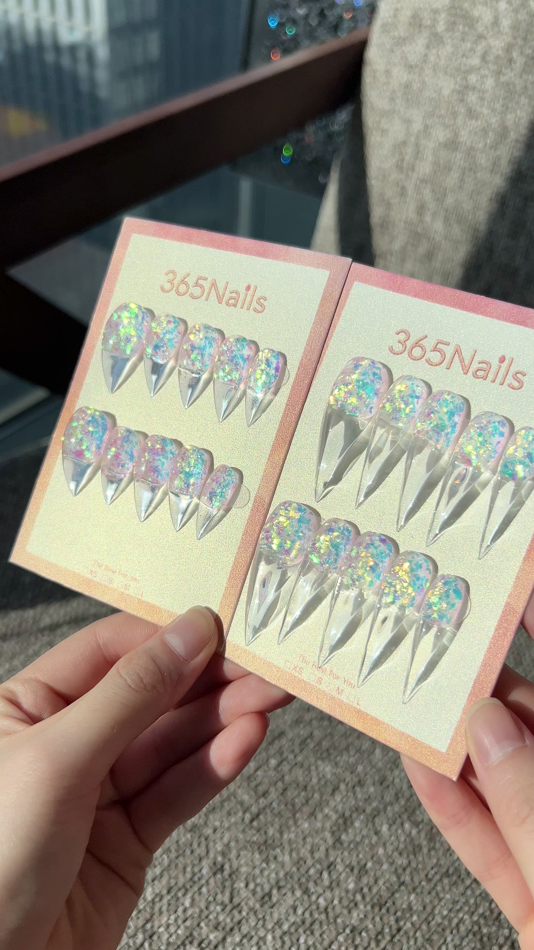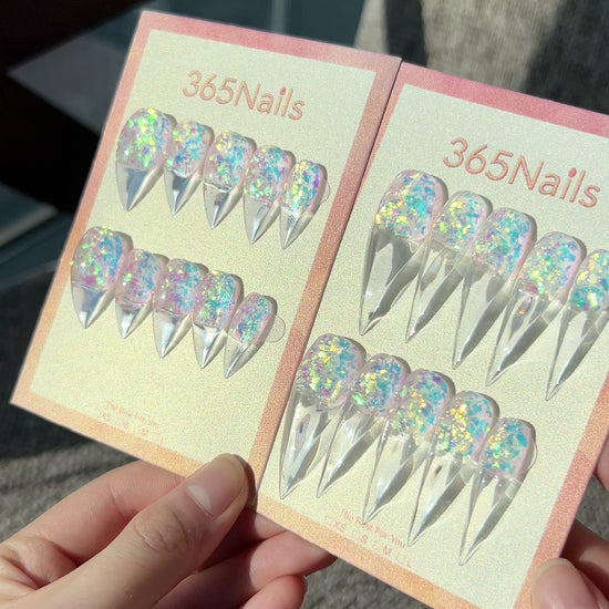 - The upper part of the nail is covered in iridescent “aurora” glitter flakes that reflect blue, purple, and pink tones under sunlight or studio lights, as if frozen aurora and ice are sealed inside the nails.