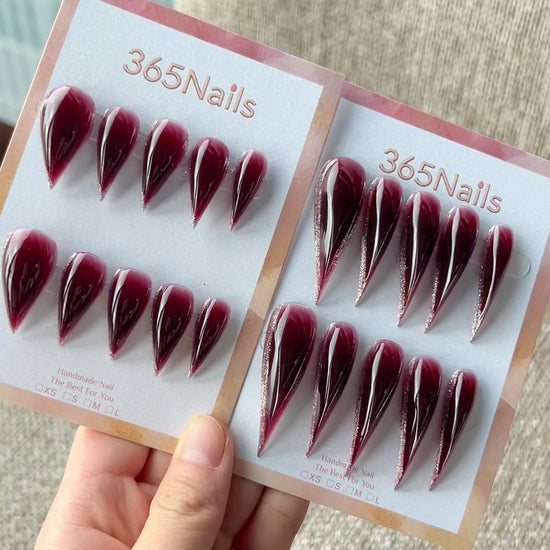 The design showcases a sheer jelly texture in a rich wine‑red hue that deepens toward the tip, resembling red wine swirling inside glass under the light. Subtle, glossy, and luxurious, it gives the hands a radiant, refined look — perfect for evening wear, fall and winter outfits, parties, or adding a sultry touch to any chic, dark‑toned style.