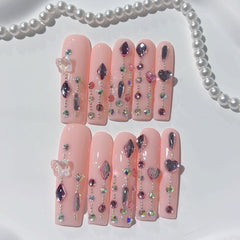 Soft blush pink bases are layered with cascading crystal drops, heart gems, and iridescent accents. The design feels elegant and glamorous, blending sweet romance with high-shine sparkle to create a refined, feminine, and eye-catching statement mood.