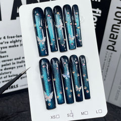 Armadura hecha a mano con destellos de ojo de gato azul, mariposa en relieve 5D, uñas largas, uñas de pipa de agua súper largas|365nails