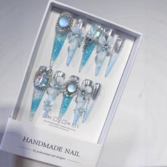 Icy Blue Sculpted Floral Crystal Fantasy Press On Nails