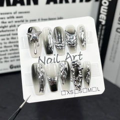 Uñas postizas hechas a mano con pistola rociadora, cambio gradual irregular, metal, color contrastante, parche para uñas medianas y largas, adhesivo para uñas usable | 365nails