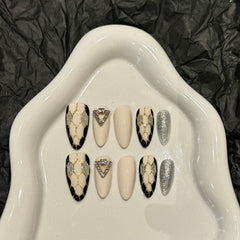 Uñas de lujo pintadas a mano con diseño de serpiente en blanco y negro, con efecto diamante, efecto ojo de gato gris | 365nails