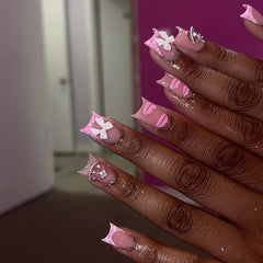 Manicura francesa blanca corta con estampado de labios rosados dulces y cuadrados |365nails