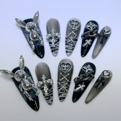 Gothic Press-On Nails with Silver Charms and Dark Gradient Style