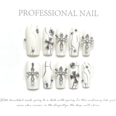 Uñas de guerra blancas rectangulares con forma de cruz, diamante pegado, bola de acero, pintadas a mano, uñas postizas Spice Girl, uñas postizas hechas a mano, arte extraíble | 365nails