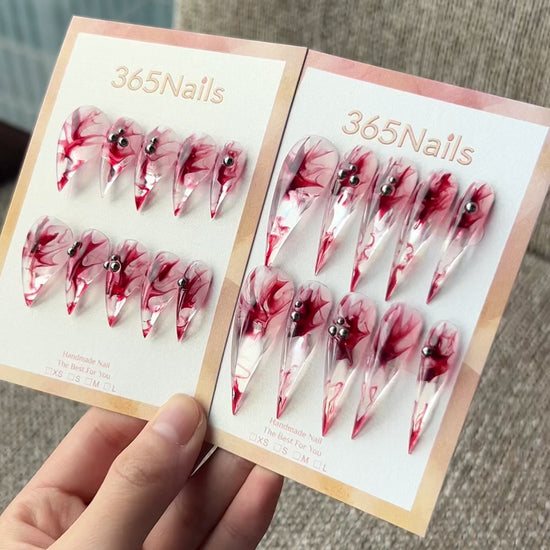 Bloody Rose Dragon Claw Stiletto Clear Jelly with Red Ink Marble & Metal Studs|365Nails Premium Handmade Dragon Nail