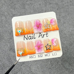 Uñas postizas con forma de pico de pato, color naranja y rosa, con grabado tridimensional mágico, con efecto hielo, cambio gradual, hechas a mano, venta al por mayor | 365nails