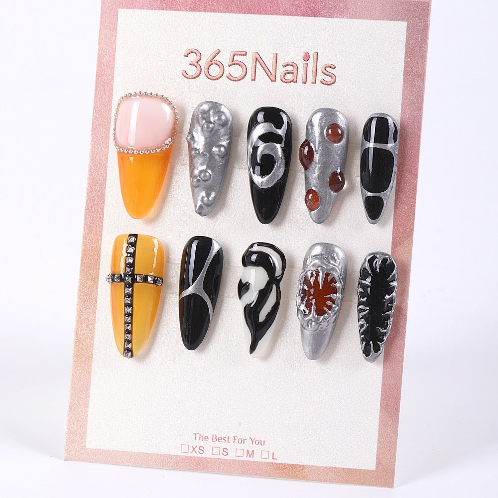 Bold black‑and‑white meets amber orange, finished with sculpted molten‑silver textures, bubbled metal details, fluid lines, rust‑red resin gems, and a studded cross. Long almond silhouette elongates the fingers—perfect for parties, night shoots, and stage looks. Easy, secure press‑ons for instant industrial‑edgy impact.