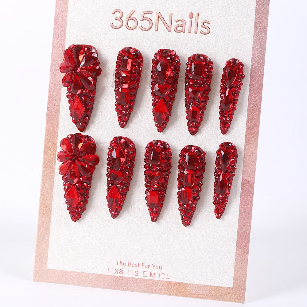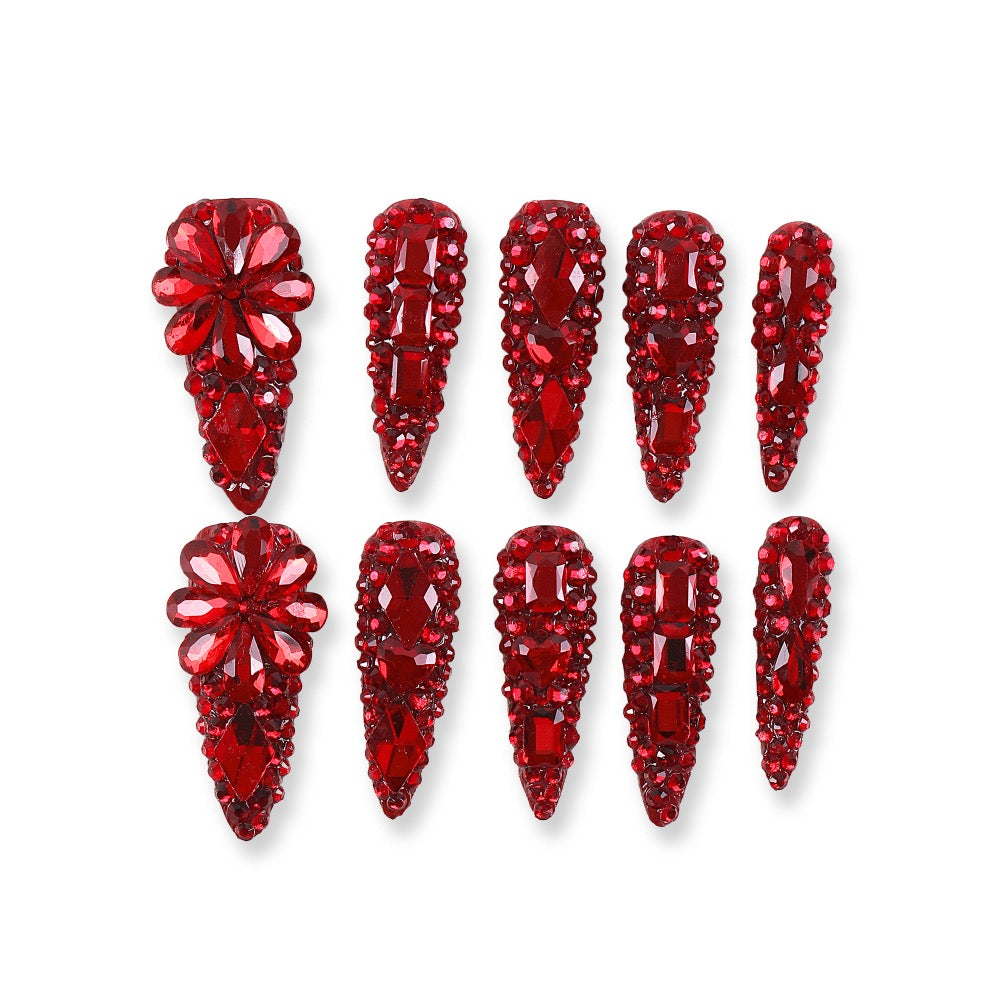 Drenched in ruby‑red crystals with mixed cuts for maximal sparkle, finished with 3D bouquet accents. Long stiletto silhouette elongates the fingers—perfect for parties, holidays, and stage looks. Easy, secure press-ons with lasting high shine.