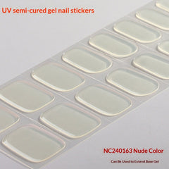 Semi-cured Gel Nail Strips are made from real liquid gel, cured to 60% for a flexible fit. They apply in minutes and harden under a UV lamp for a glossy, salon-quality finish that lasts up to two weeks. No smudging, no drying time, and easy removal.