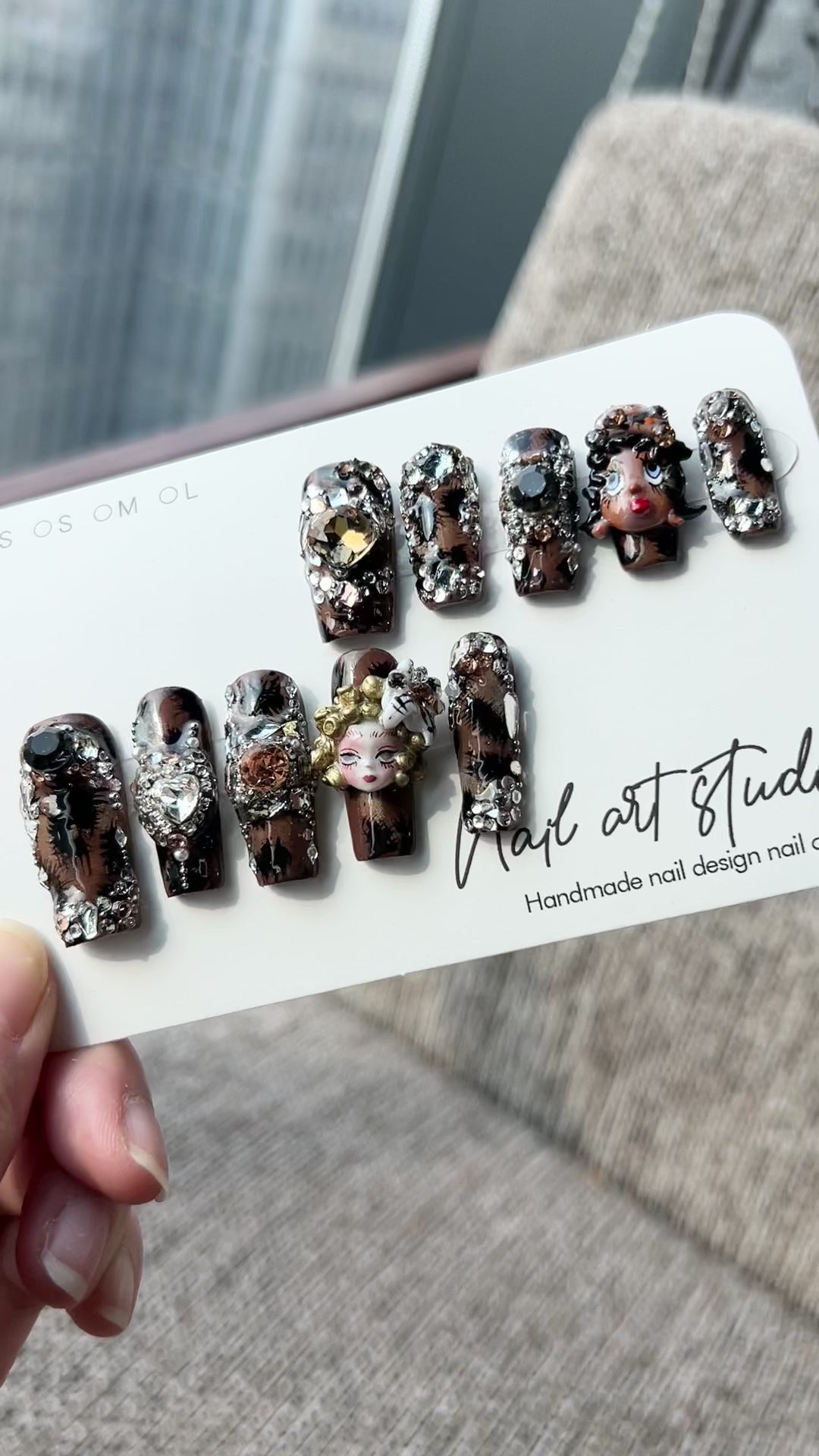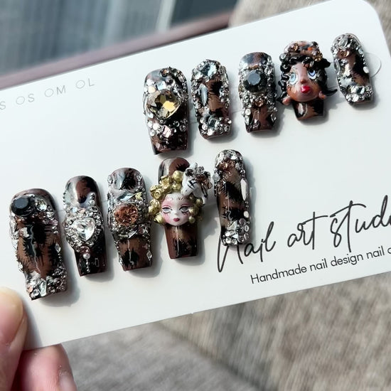 The design is anchored by a fierce leopard print base in warm mocha and black tones, heavily encrusted with high-quality rhinestones that catch every light. The true showstoppers are the hand-sculpted 3D portraits: one features a cheeky, black-haired pin-up girl reminiscent of the iconic Betty Boop, complete with red lips and flirty lashes; the other showcases a blonde, sleeping beauty with golden curls. It's a perfect blend of retro nostalgia and modern bling.